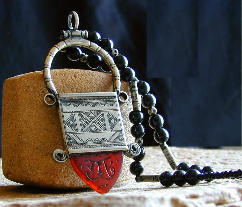 Hier wurde ein rotes Glasdreieck mit einem Koranspruch eingearbeitet, das von der Haddsch, der Pilgerfahrt nach Mekka mitgebracht wurde, das Kreuz ist mit einer außergewöhnlichen Punzarbeit verziert.