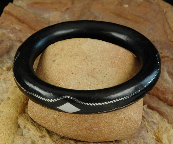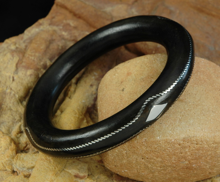 Angeboten wird hier eine dekorative Armspange aus schönem Ebenholz, in die Metallfäden eingeschlagen wurden. Dieses traditionelle Handwerk wird von den Sahara Nomaden in Mauretanien ausgeübt.