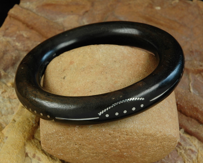 Angeboten wird hier eine dekorative Armspange aus schönem Ebenholz, in die Metallfäden eingeschlagen wurden. Dieses traditionelle Handwerk wird von den Sahara Nomaden in Mauretanien ausgeübt.