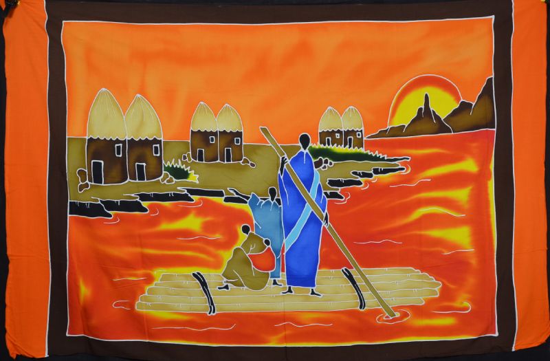Afrika Batik Stoff / Wandbehang - Familie auf dem Floß