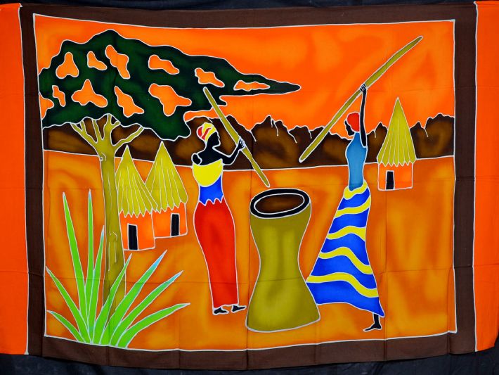 Die Motive sind in einer Batiktechnik mit leuchtenden Farben aufgebracht, mit schönen Motiven aus dem täglichen Leben.