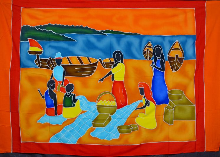 Afrika Batik Stoff / Wandbehang - Markt beim Fischerhafen