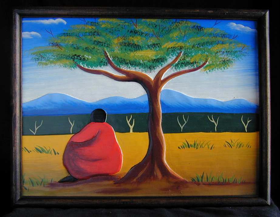 Die Bilder sind aus Holz reliefartig, erhaben geschnitzt und dann mit plakativen Farben bemalt.
