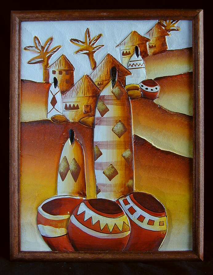 Die Bilder sind aus Holz reliefartig, erhaben geschnitzt und dann mit plakativen Farben bemalt.