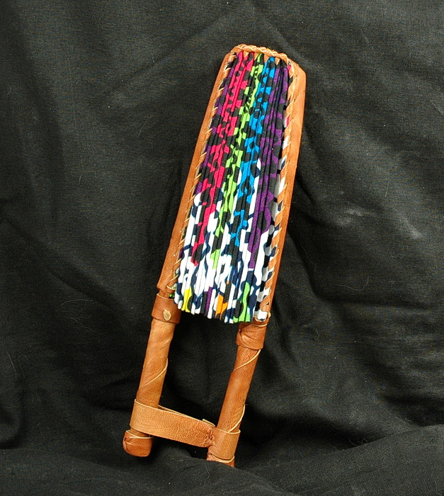 Er ist aus afrikanischem Baumwoll Stoff hergestellt und hat schön mit Leder umwickelte Griffe.