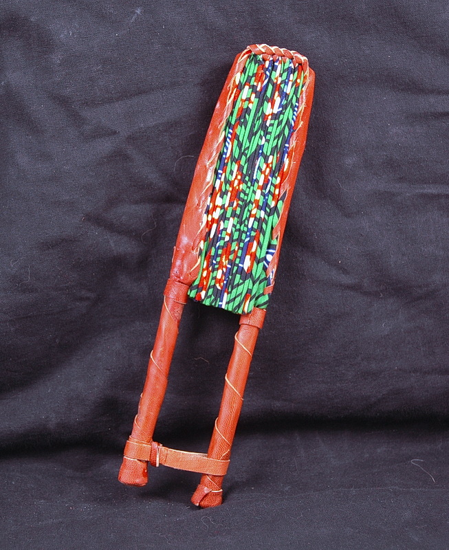Er ist aus afrikanischem Baumwoll Stoff hergestellt und hat schön mit Leder umwickelte Griffe.