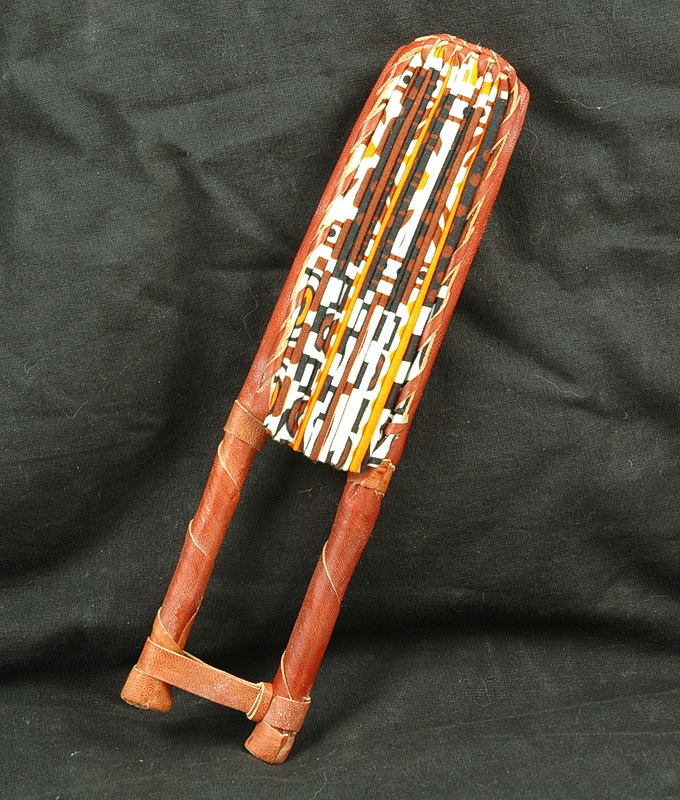 Er ist aus afrikanischem Baumwoll Stoff hergestellt und hat schön mit Leder umwickelte Griffe.