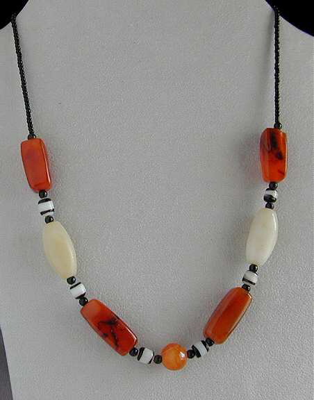 Tuareg Kette mit schönen roten und weißen Achatperlen und schwarzen Glasperlen. Die älteren Achatperlen wurden früher aus Idar Oberstein importiert und dann in Afrika bei der Schmuckherstellung verwendet.