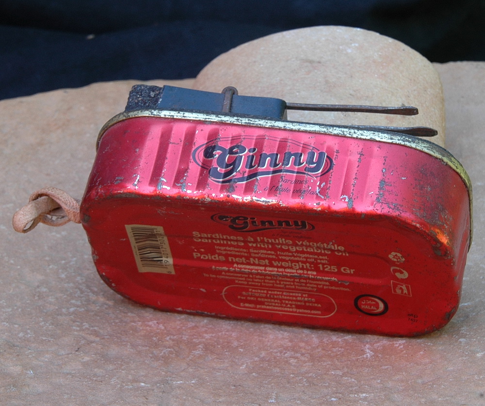 das Instrument ist aus einer receycelten Sardinendose als Klangkörper und einem eingesetzten Holzstück als Deckel gearbeitet.