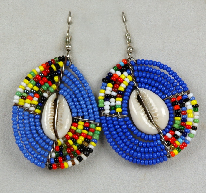 Dekorative Afrika Ohrringe mit blauen Glasperlen & Kauri Muschel