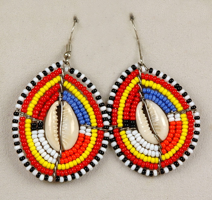 Dekorative Afrika Ohrringe mit bunten Glasperlen & Kauri Muschel