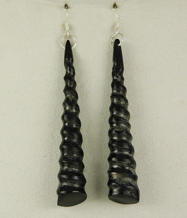 An einem Silber Ohrbügel hängt der Anhänger, der aus Horn ( Rind ) geschnitzt und schön verziert ist.
