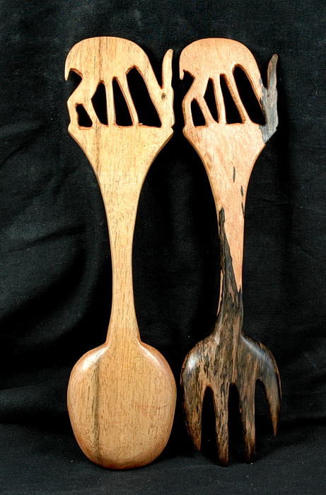 Das handgeschnitzte Salatbesteck ist aus schön gemasertem Ebenholz gearbeitet.