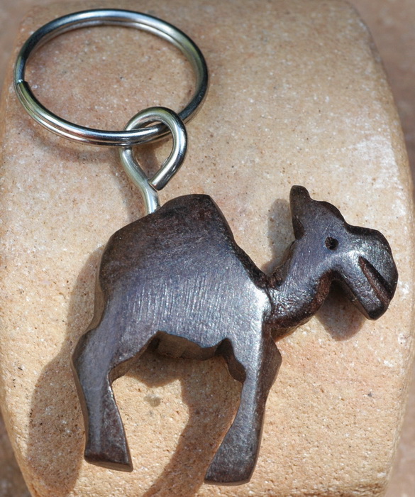 Hier wird ein aus Ebenholz geschnitzter Schlüsselanhänger angeboten, dekorativer Afrika Schmuck mit dem Motiv Kamel.