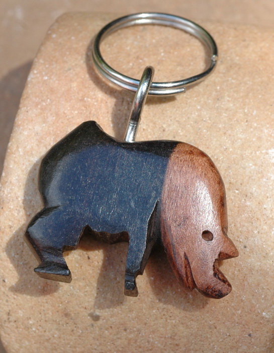 Hier wird ein aus Ebenholz geschnitzter Schlüsselanhänger angeboten, dekorativer Afrika Schmuck mit dem Motiv Nashorn.
