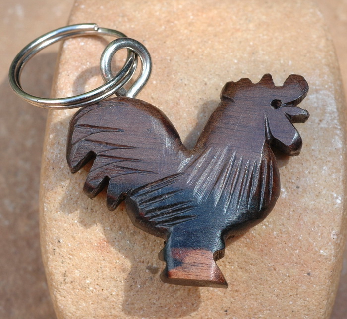 Hier wird ein aus Ebenholz geschnitzter Schlüsselanhänger angeboten, dekorativer Afrika Schmuck mit dem Motiv Huhn.