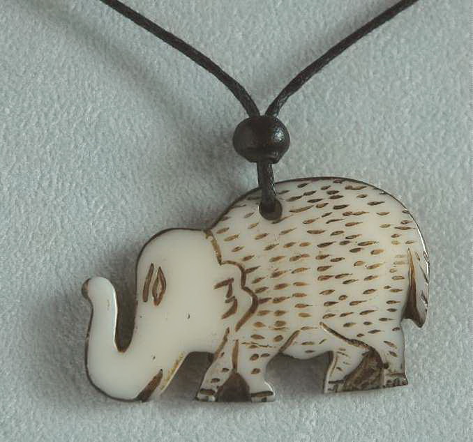 An einem Baumwollband hängt der aus Rinder Knochen handgeschnitzte Anhänger, Motiv - Elefant.