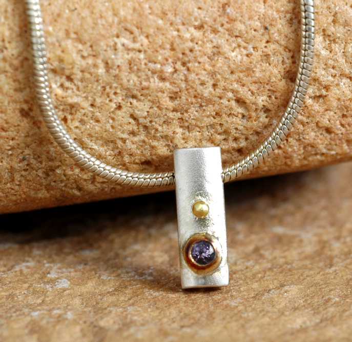 Diese moderne Halskette ist aus Silber gearbeitet, der Anhänger ist mattiert und teilweise vergoldet, als Highligt dient der schöne Amethyst.