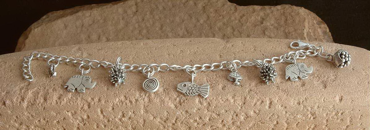 Das ausgefallene Armband ist filigran gearbeitet mit schönen Anhängern, unter anderem Igel, Elefant, Fisch, Spirale und Pilz.