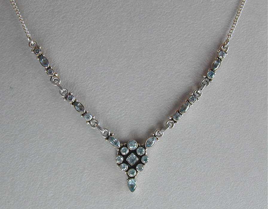 Diese Halskette ist filigran aus glänzendem Silber gearbeitet. Highlight sind die schön geschliffenen Blautopas Steine.