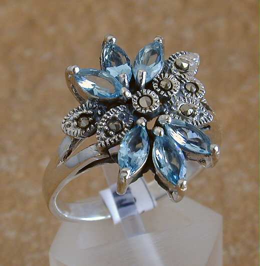 Extravaganter Silber Ring mit Markasit Steinen und Blautopas