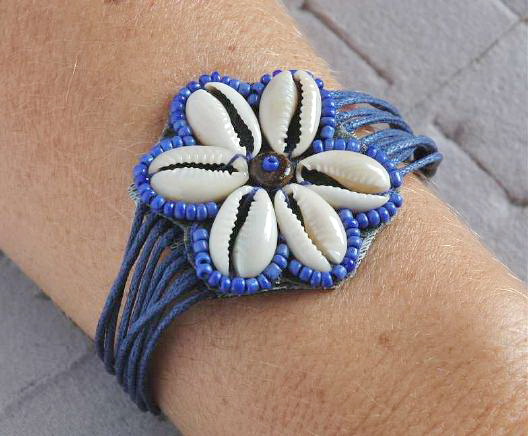 Dekoratives Blüten Armband mit Kauri Muscheln in Blau