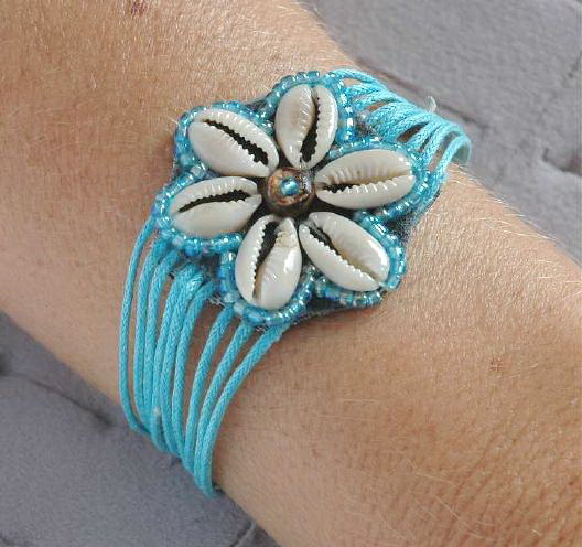 Dekoratives Blüten Armband mit Kauri Muscheln in Türkis