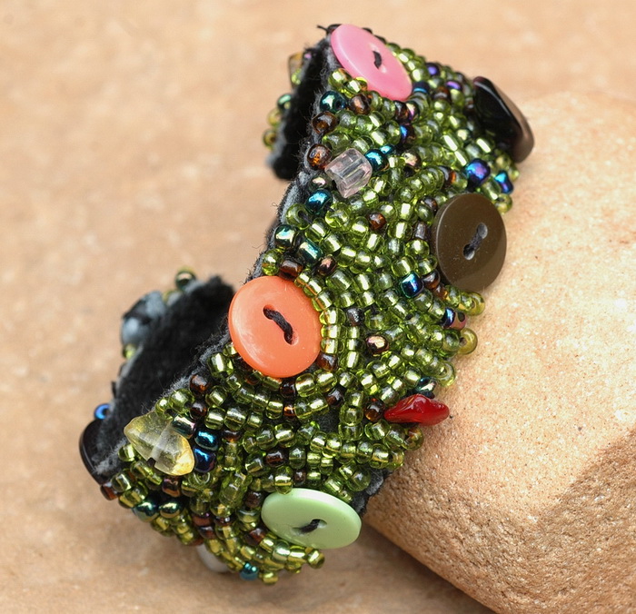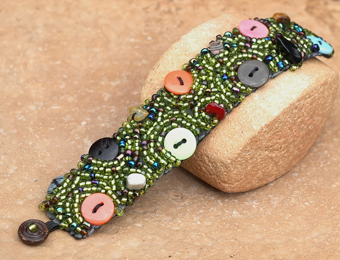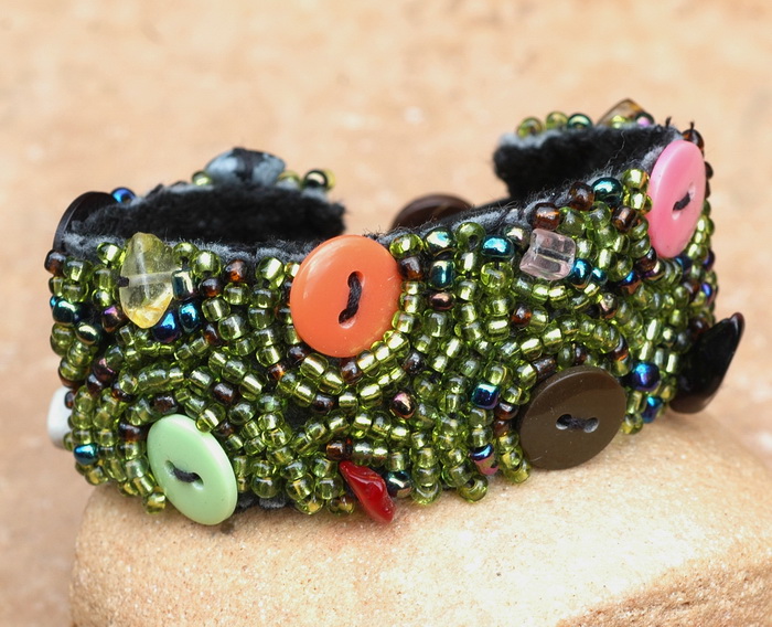 Angeboten wird hier ein handgefertigtes Armband, bei dem auf eine Stoffunterlage die Knöpfe, Glasperlen und Edelsteine aufgenäht werden.
