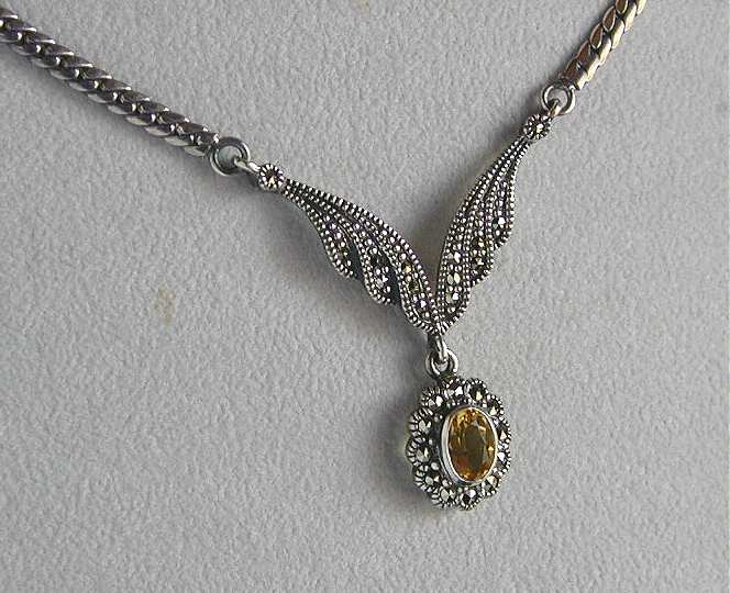 Dieses Modell ist filigran mit Markasit Steinen und schön geschliffenem Goldtopas gearbeitet, so kommt die schöne Kombination voll zur Geltung.