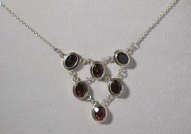 Diese Halskette ist ausgefallen aus glänzendem Silber gearbeitet, Highlight sind die schön geschliffenen Granate.
