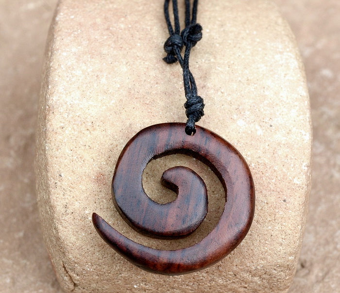 An einem Baumwollband hängt der Anhänger, Motiv " Spirale ", aus schön gemasertem Ebenholz geschnitzt.