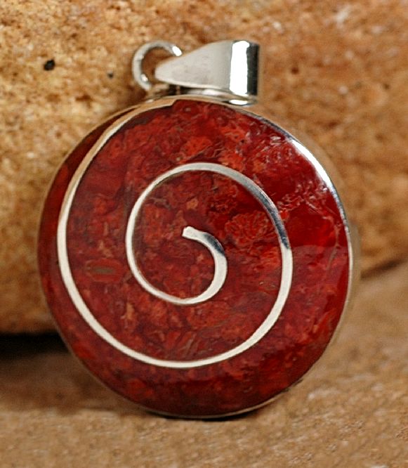 Dieses Modell ist dekorativ mit roter Schaumkoralle und eingelegter Silberspirale gearbeitet, in der Kombination kommt der schöne Stein voll zur Geltung.