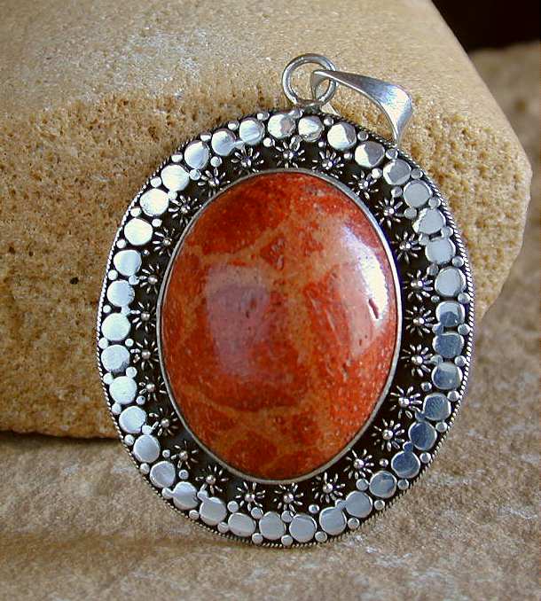 Dieses Modell ist mit roter Schaumkoralle und einer wunderschönen, sehr aufwendigen Silberarbeit gefertigt, in der Kombination kommt der schöne Stein voll zur Geltung.