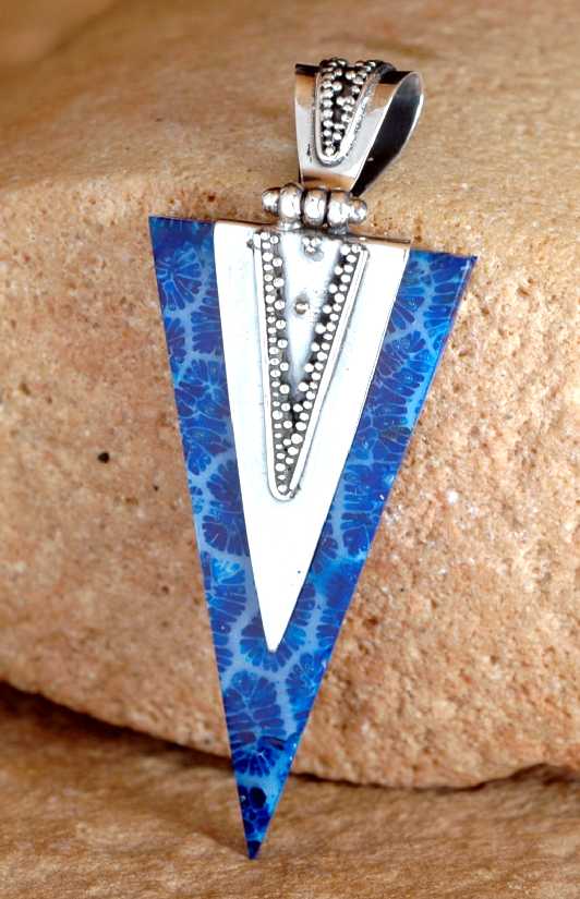 Dieses Modell ist dekorativ mit blauer Schaumkoralle und Silber gearbeitet.