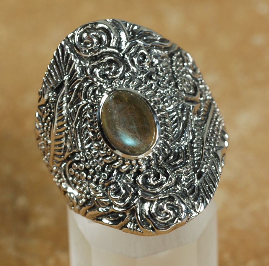 Dieses Modell ist mit einem schimmernden Labradorit und dekorativer Silberarbeit handgefertigt, in der Kombination kommt der schöne Ring voll zur Geltung.