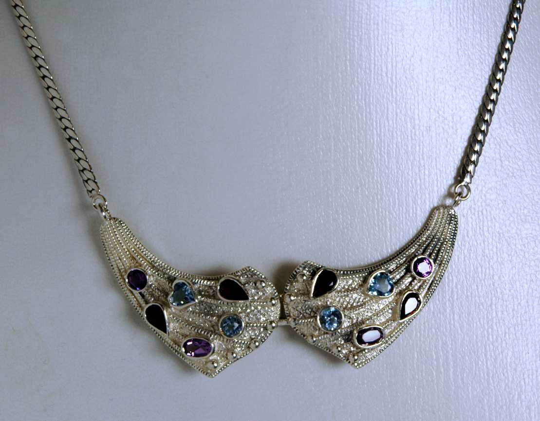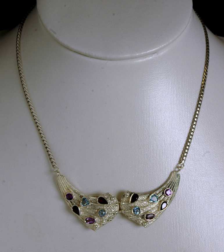 Dekorative Markasit Silber Halskette - Blautopas, Granat und Amethyst