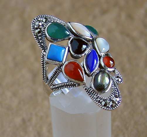 Extravaganter Silber Ring mit Markasit Steinen und verschiedenen Halbedelsteinen