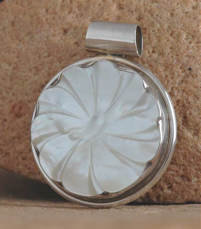 Dieses Modell ist mit einer geschnitzten, schillernder Muschel und modern schlichter Silberarbeit gefertigt, in der Kombination kommt die schöne Muschel voll zur Geltung.