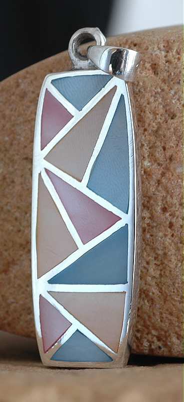 Dieses Modell ist modern gearbeitet mit unterschiedlich eingefärbten Muschelstücken und Silber.