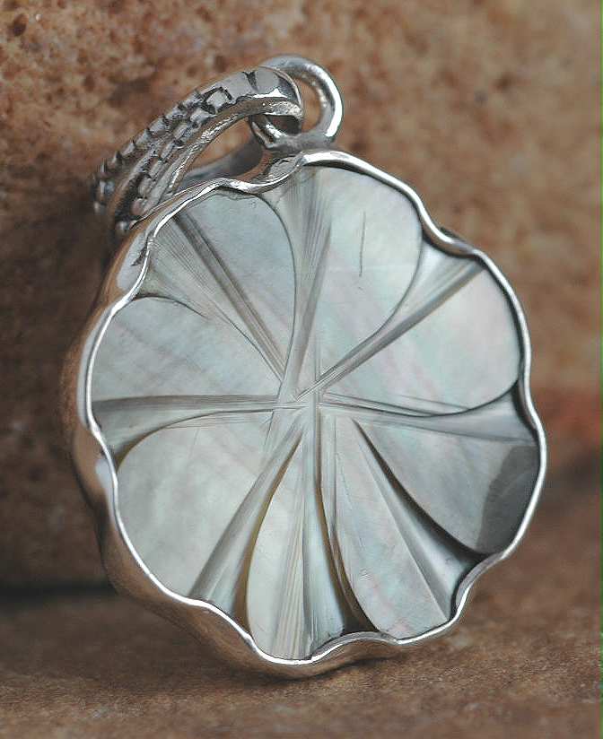 Dieses Modell ist mit einer geschnitzten, schillernder Muschel und modern schlichter Silberarbeit gefertigt, in der Kombination kommt die schöne Muschel voll zur Geltung.