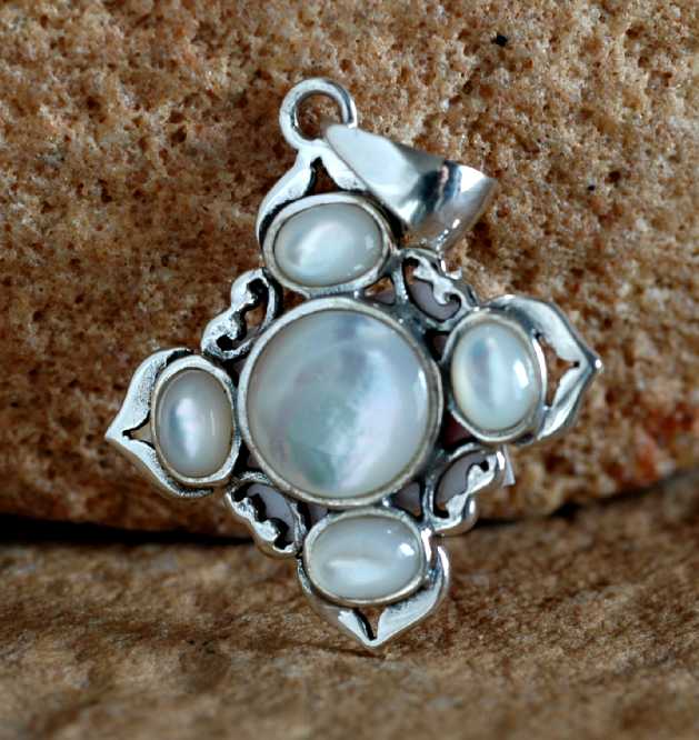 Dieses Modell ist mit Perlmutt und einer filgranen Silberarbeit gefertigt, in der Kombination kommt die schöne Muschel voll zur Geltung.
