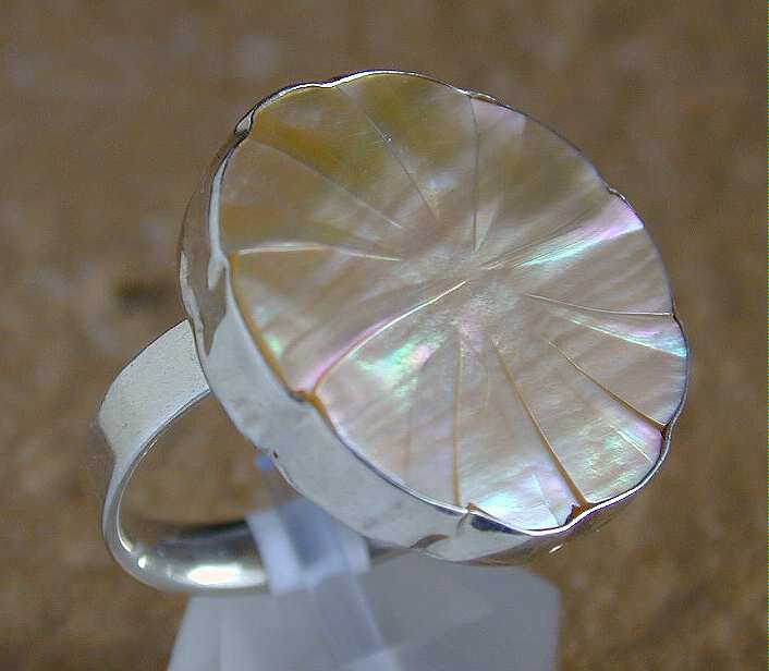 Dieses Modell ist mit geschnitztem Perlmutt und modern schlichter Silberarbeit gefertigt, in der Kombination kommt die schöne Muschel voll zur Geltung.