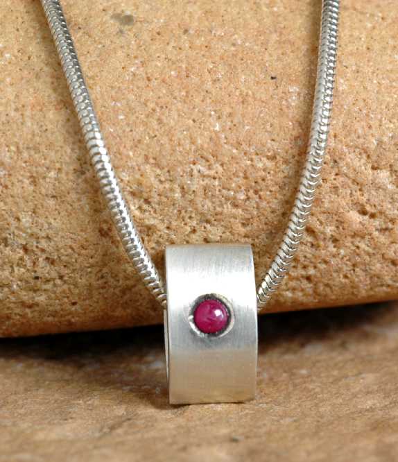 Dieser Anhänger ist modern schlicht aus mattiertem Silber handgearbeitet, als Highligt dient der schöne Rubin.