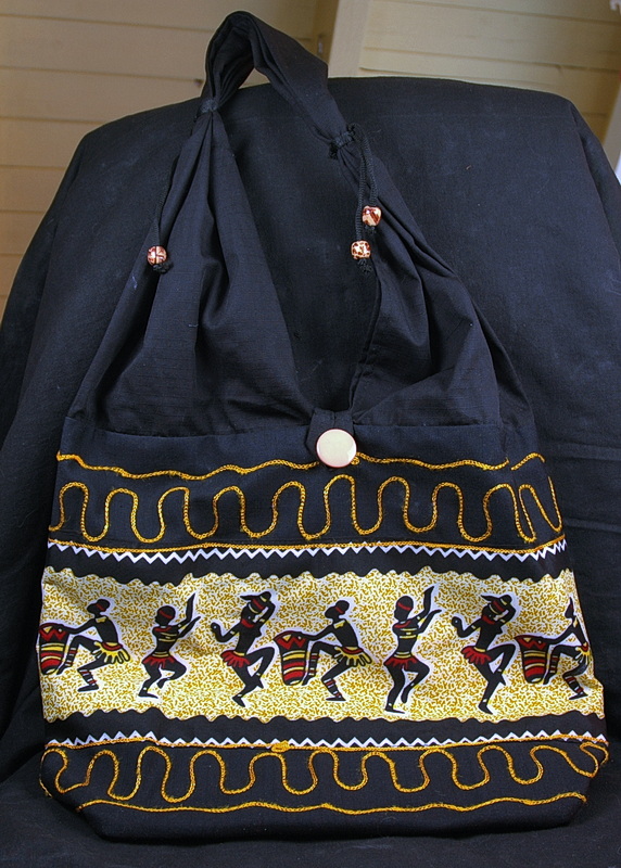 Sie ist aus afrikanischem Baumwollstoff hergestellt, mit Stickereien verziert, innen gefüttert und kann oben mit einem Knopf verschlossen werden.