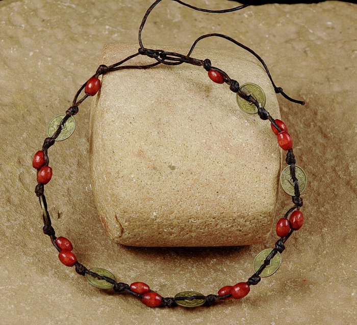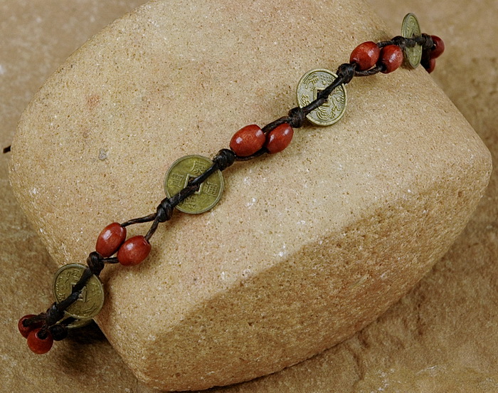 An einem Baumwollband werden die Münzen eingefädelt, dazwischen rötliche Holzperlen.