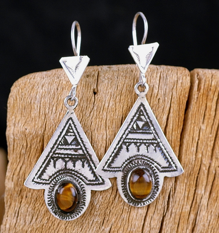 Die Tuareg Ohrringe wurden aus Silber gefertigt, in der Mitte ist ein schöner brauner Tigerauge Stein eingefügt. Das Silber ist traditionell bearbeitet und mit traditionellen Mustern und Design versehen.