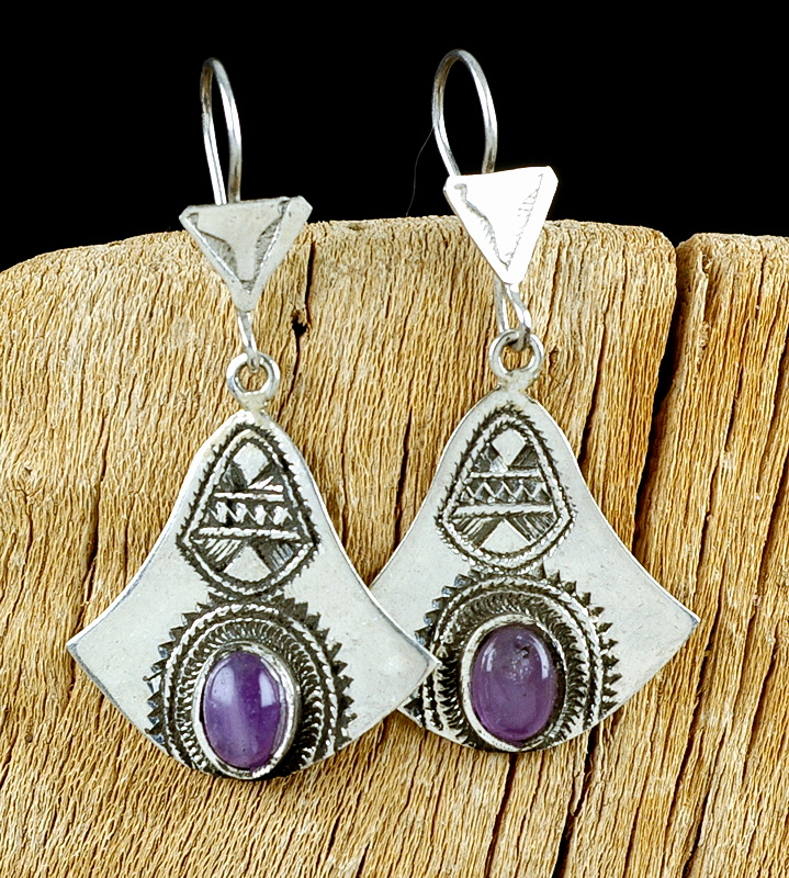 Die Tuareg Ohrringe wurden aus Silber gefertigt, in der Mitte ist ein schöner lila Amethyst eingefügt. Das Silber ist traditionell bearbeitet und mit traditionellen Mustern und Design versehen.