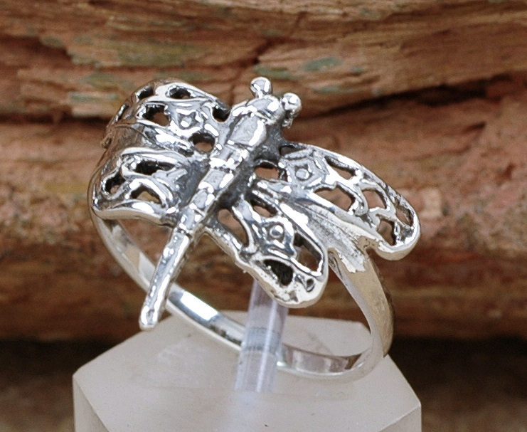 Sie sehen hier einen filigran gearbeiteten Ring aus massivem Silber, mit einem schönen Libellen Motiv.