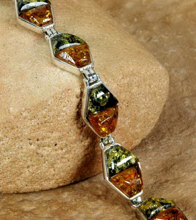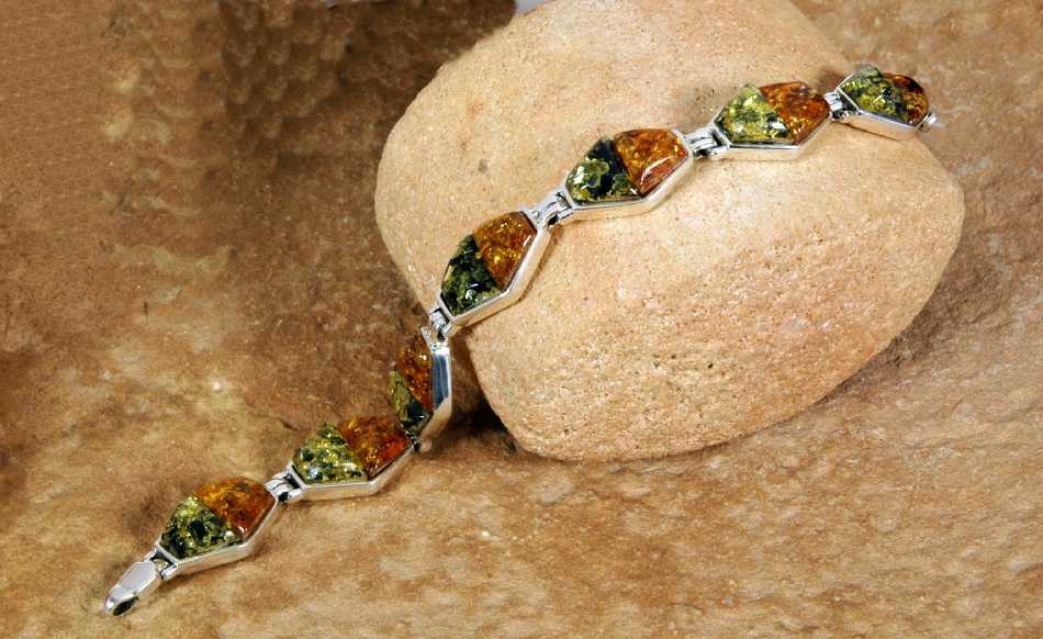 Dieses dekorative Armband ist aus Silber 925 mit gelbem und grünem Bernstein gefertigt.