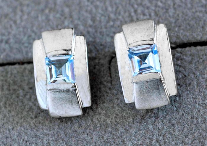 Dieses Ohrsteckerpaar ist modern gefasst mit schönem Blautopas in Silber 925, eine Kombination aus glänzendem und mattiertem Silber.